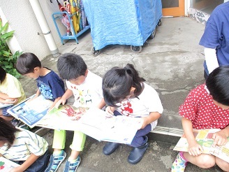 幼稚園の小屋の中は涼しくて、まったりできるスペースとなっていました。一緒に遊んだ幼稚園のお友だちに楽しい場所をたくさん案内してもらいました。他にも運動会で取り組んだという竹馬に挑戦させてもらったり、大縄跳びを幼稚園のお友だちとしたり、交流会を通して色々な友だちと親しくなりました。
