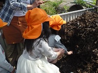 4月20日に4歳児ぞう組と5歳児らいおん組が、給食を作る時に出た野菜くずを使って、園庭の畑の土作りをしました。みさわ保育園の伝統になっているこの活動は、まさに「SDGs」の一環となっています。ゴールデンウィーク明けに夏野菜の苗を植える頃には、栄養満点の土ができあがります。