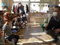 夏に作った七夕飾りのお礼にと、日野療護園の職員の方が、織姫ロボットと一緒に来てくれました。今回は、3歳児こあら組の子どもたちが参加しました。初めて出会う織姫ロボットに、緊張しながらも興味津々の子どもたちでした。