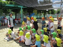 毎月、様々な災害を想定して避難訓練を行っています。9月は地震から火災が発生した想定で訓練を行いました。まずは第一避難場所の園庭に避難し、4,5歳児はその後、第三避難場所の七生緑小学校まで実際に歩いてみました。お散歩とは違う雰囲気のなか、真剣に話を聞きながら歩いた4,5歳児さんでした。