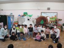 2月生まれの誕生会を行いました。今回はエコくまくんとエコアラちゃんがスペシャルゲストとしてきてくれました。子ども達も大興奮でお出迎え。エコくま・エコアラと一緒にエコダンスを踊ったり、記念写真を撮りました。エコについても楽しく教えてもらいました。