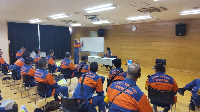日野消防署にご協力いただき、新人団員へ消防団の規律説明や過去の災害を例に実際の任務について講義を行っていただきました。