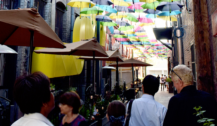レッドランズ市が近年街中の活性化を進めている所も日野市に似ています。色とりどりの傘やレストランのパティオでにぎやかなこの脇道は、つい最近までごく普通の裏通りでしかありませんでした。商店街の大通りにつながり通行の多いこの道がゴミ置き場だったなんてとても思えませんね!レッドランズ市は現在歩行者や自転車専用道をこのように整備していて、レッドランズ市の環境にも健康にも優しい町づくりはきっとウォーキングトレイルの多い日野市のみんなになじみやすいと感じました。
